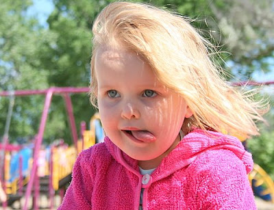 ...when you refuse to wear clippies or headbands or bows...and you lay on the floor screaming when your mommy sits on you trying to put piggies in your hair...AND your mommy is diametrically opposed to all short bangs in the world after a bad experience as a youth...the wind and your tongue are your friends for unobscured eyesight on the playground....